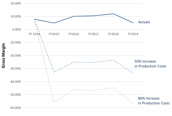 Regardless of whether you look at the next ten years or the next thirty years, this level of investment equates to between a 48-80% increase in their historical annualized CAPEX. MT’s estimated production cost increase suggests that their gross margin average from the past five years, roughly 8.55%, would drop to somewhere between -28% and -50%, all else being equal. The chart below shows what the firms’ margins would have looked like in that situation.