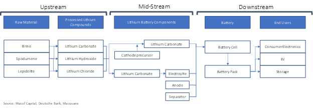 The lithium supply chain can be split into three components: upstream, mid-stream, and downstream. Upstream companies provide lithium compounds for cathode and electrolyte manufacturing, mid-stream players produce components for batteries (the cathode, anode, and electrolyte), and the downstream segment of the industry assembles batteries and packages them together. A high-level industry supply chain looks something like the graphic below.